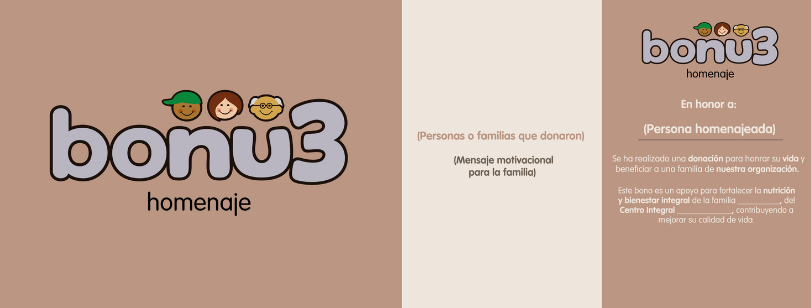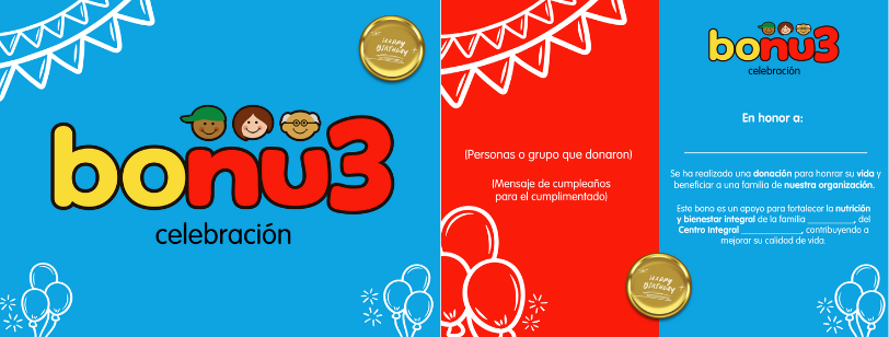 Puedes adquirir un bonu3 desde cualquier valor, sin mínimo ni máximo de donación. El bonu3 puede llevar el nombre de una persona, un grupo o una causa especial, y está pensado para celebrar, honrar o rendir homenaje a quienes dejan huella en tu vida, mientras transformas la de otros.